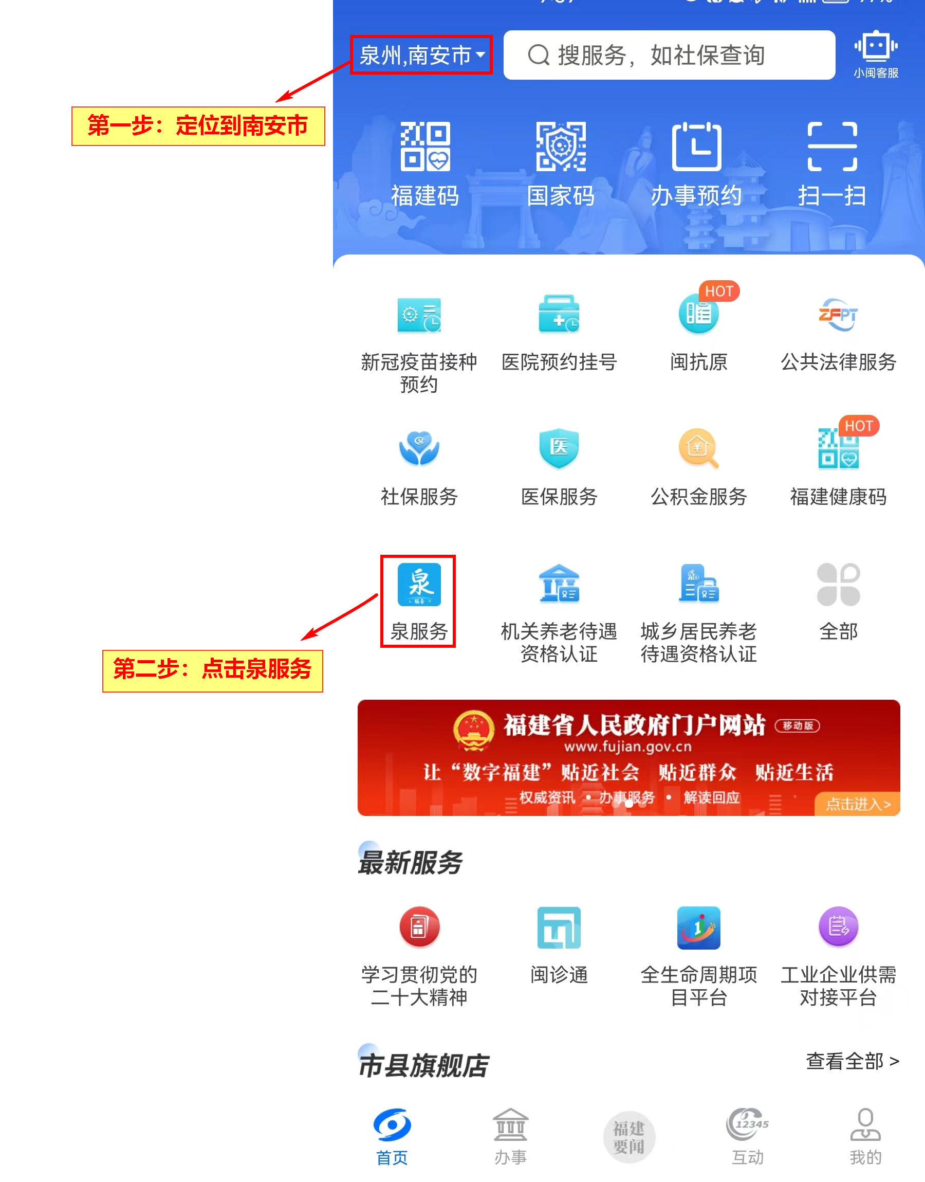 打開(kāi)閩政通APP,①定位選擇【泉州南安市】,②點(diǎn)擊【泉服務(wù)】。