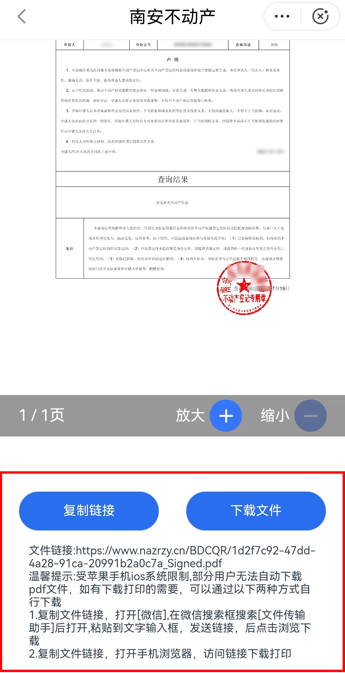 第六步:根據(jù)“個(gè)人不動(dòng)產(chǎn)登記信息查詢(xún)結(jié)果”頁(yè)面下方下載步驟獲取下載后的文件,并根據(jù)頁(yè)面提示自行打印。